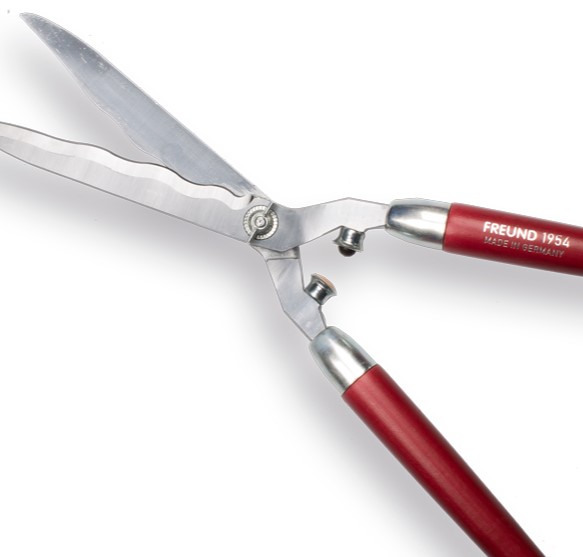 Freund type 1954 met holle gegolfde snede. Meestverkochte gesmede heggenschaar met hardverchroomde messen. De schaar is zelf-slijpend. De aanslagdempers met lange levensduur zorgen voor comfortabel knippen. Voorzien van rode houten handvaten met verchroomde kappen. De gegolfde snede dient voor weerstand en snoeit gemakkelijk houtachtige heggen. Zeer degelijke Duitse fabricage voor professioneel en particulier gebruik.